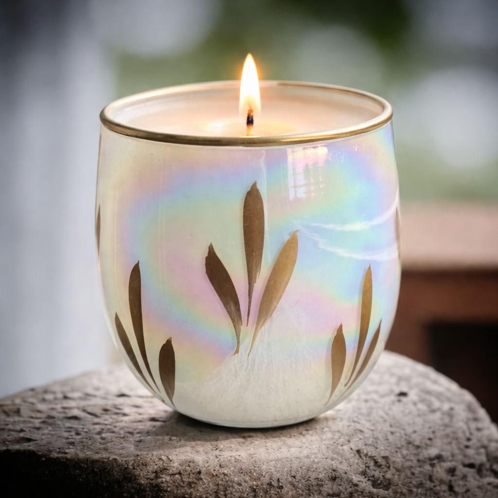 A handcrafted 100 gms candle housed in an elegant iridescent glass holder with subtle golden accents. Designed to cast a soft, warm glow, it adds a touch of luxury and charm—perfect for festive décor, gifting, or everyday ambience.